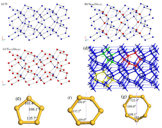 The crystal structures of Si (a), Si0.667Ge0.333 (b), Si0.333Ge0.667 (c) alloys in P42/ncm phase. The blue and red spheres represent the Si atoms and Ge atoms. Si5, Si6 and Si7 rings in the 2 × 2 × 2 supercell (d). Si5 (e), Si6 (f) and Si7 (g) rings in the P42/ncm phase.