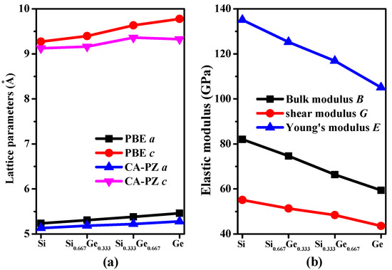 Lattice parameters (a) and elastic modulus (b) as a function of germanium concentration for Si–Ge alloys in P42/ncm phase.