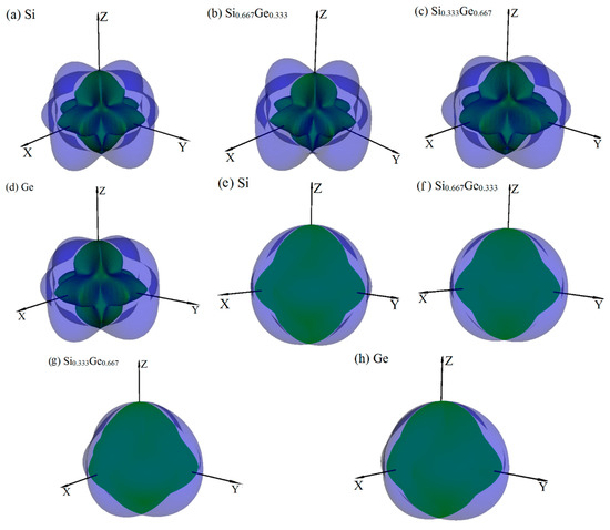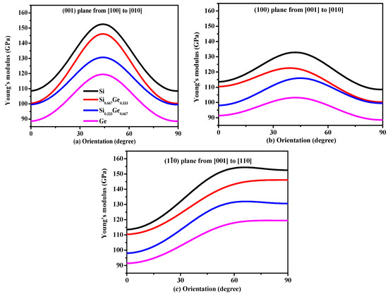 Orientation dependence of Young’s modulus in (001) plane (a), (100) plane (b) and () plane (c) for Si, Si0.667Ge0.333, Si0.333Ge0.667 alloys and Ge in the P42/ncm phase.