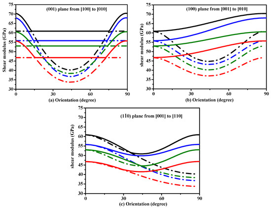 To understand plastic deformations in Si, Si0.667Ge0.333 Si0.333Ge0.667 and Ge in P42/ncm phase, the variations of the shear modulus on stress direction are plotted in Figure 5. In Figure 5, in all the shear planes, the variation tendencies of shear moduli of Si, Si0.667Ge0.333 Si0.333Ge0.667 and Ge in P42/ncm phase with the increasing percentage of the Ge composition are similar. In addition, the variation tendencies of shear moduli of Si, Si0.667Ge0.333 Si0.333Ge0.667 and Ge in P42/ncm phase with the angle γ that is between the [100] and shear stress direction are also similar. For (001) shear plane, with the shear stress direction rotated from [100] direction to [010] direction, the shear moduli of P42/ncm-Si are equal to each other when the angle γ is from 13° to 75°. The range of the same shear moduli of Si0.667Ge0.333 Si0.333Ge0.667 and Ge in P42/ncm phase decreases with the increasing percentage of the Ge composition. Unlike (001) shear plane, with the shear stress direction rotated from [100] direction to [010] direction, there is no region with the same shear moduli in the (100) shear plane with the shear stress direction rotated from [001] direction to [010] direction and () shear plane with the shear stress direction rotated from [001] direction to [110] direction. From Figure 5, the ordering of the shear modulus when the tensile axis is along a specific direction is: G[100] ≈ G[010] > G[001] ≈ G[110].