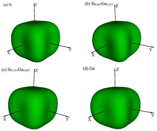 The surface constructions of Young’s modulus E for Si (a), Si0.667Ge0.333 (b), Si0.333Ge0.667 (c) and Ge (d) in the P42/ncm phase. For all graphs, the units are in GPa.