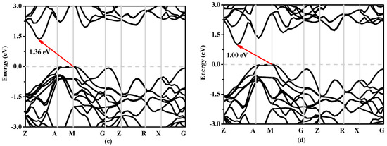 In solid state physics, the energy band structure of a solid, also known as the electron band structure, describes the energy that is forbidden or permitted by electrons. The band structure of a material determines a variety of properties, especially its electronic and optical properties. The band structures of Si, Si0.667Ge0.333, Si0.333Ge0.667 and Ge in P42/ncm phase calculated utilizing the Heyd–Scuseria–Ernzerhof (HSE06) [32,33] hybrid functional are shown in Figure 8a–d, respectively. The calculated band gaps of Si, Si0.667Ge0.333, Si0.333Ge0.667 and Ge in P42/ncm phase are 0.63 eV, 0.58 eV, 0.55 eV and 0.39 eV utilizing the CA-PZ function, respectively; the band gaps of Si and Ge in P42/ncm phase are in excellent agreement with the previous report [19]. In Figure 8, one can see that the band gaps of the Si, Si0.667Ge0.333, Si0.333Ge0.667 and Ge in P42/ncm phase are all much larger than those of the CA-PZ function. From Figure 8, the P42/ncm-Si, P42/ncm-Ge and their alloys Si0.667Ge0.333, Si0.333Ge0.667 in P42/ncm phase are all indirect band gaps with band gaps of 1.46 eV, 1.00 eV, 1.25 eV and 1.36 eV, respectively. The valence band maximum (VBM) of the P42/ncm-Si, P42/ncm-Ge and their alloys Si0.667Ge0.333, Si0.333Ge0.667 are all located at M point, while the conduction band maximum (VBM) of the P42/ncm-Si, P42/ncm-Ge and their alloys Si0.667Ge0.333, Si0.333Ge0.667 in P42/ncm phase are all located at the point (0.196 0.196 0.5) along the Z-A direction. In addition, the Fermi level of Si, Ge and their alloys Si0.667Ge0.333, Si0.333Ge0.667 in P42/ncm phase decreases with the increasing percentage of the Ge composition.