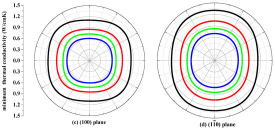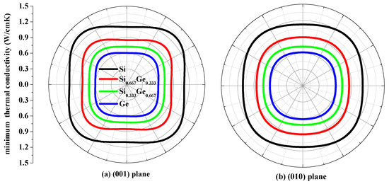 The thermal conductivity κ is the property of a material that conducts heat in physics. The minimum thermal conductivity κmin can be calculated using the following theoretical method, namely, Clarke’s model [43], expressed as follows: κmin = 0.87kBm−2/3(E/ρ)1/2, where m is the number of atoms in unit volume, and m = (M/nρNA), M is the molecular weight; n is the number of atoms in the unit cell, kB is Boltzmann’s constant, NA is Avogadro’s number, ρ is the density of the P42/ncm-Si, P42/ncm-Ge and their alloys Si0.667Ge0.333, Si0.333Ge0.667. The calculated minimum thermal conductivity κmin of the P42/ncm-Si, P42/ncm-Ge and their alloys Si0.667Ge0.333, Si0.333Ge0.667 in different planes are plotted in Figure 9. The black, red, green and blue line representations denote the minimum thermal conductivity of the Si, Si0.667Ge0.333 Si0.333Ge0.667 and Ge in P42/ncm phase, respectively. From Figure 9, the minimum thermal conductivity of the Si, Si0.667Ge0.333, Si0.333Ge0.667 and Ge in P42/ncm phase exhibits varying degrees of anisotropic properties in different planes. In (001), (010) and (100) planes, the values of the minimum thermal conductivity κmin is almost a square with four rounded vertex angles, while the minimum thermal conductivity κmin in () plane is like an inverted ellipse. The minimum thermal conductivity κmin of the Si, Si0.667Ge0.333, Si0.333Ge0.667 and Ge in P42/ncm phase decreases with the increasing percentage of the Ge composition, as will be readily seen. Also, the minimum thermal conductivity κmin decreases more and more slowly with the increasing percentage of the Ge composition.