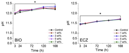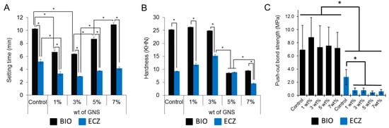 4.2. Setting Time, Hardness, Push-Out Bond Strength, and pH