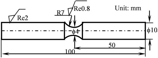The samples were loaded in the cantilever under the typical loading W, as shown in Figure 2. The applied stress amplitude (σ, MPa) in the rotating bending fatigue tests was estimated as follows: