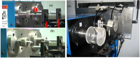 In Equation (1), d is the diameter of the gauge section (i.e., 4 mm, as shown in Figure 1), g is the acceleration of gravity (9.8 m/s2), K is the stress concentration factor (1.08), L is the distance from the gauge section to the end at which the load is applied (about 40.5 mm for a standard sample) and W is the applied load (kg). All rotating bending fatigue tests were controlled at a stress ratio of R = −1 and at a rotating frequency of approximately 55 Hz [14,20,21]. Corrosion media, including air and a 5.0 wt % NaCl aqueous solution, were used in these tests. In the corrosion fatigue test, the corrosive liquid was dripped at a rate of 1.6 mL/min.