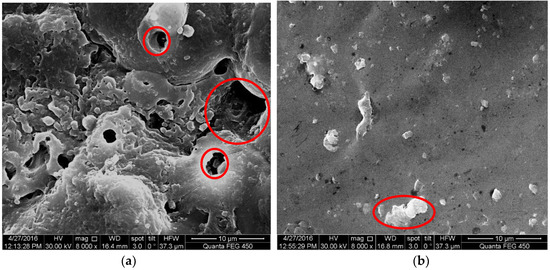 Figure 3 shows surface structures of MAO coated samples, respectively without and with a pore-sealing treatment. The shrinkage cavities and thermal-cracks on the surface of samples without a pore-sealing treatment are clearly shown in Figure 3a; the maximum diameter of cavities was about 10 μm and the average diameter was about 2–3 μm. For the surface of samples with a pore-sealing treatment, these shrinkage cavities were filled by the epoxy resin, however a few agglomerates of epoxy resin were found as shown in Figure 3b. The surface of the MAO coating with a pore-sealing treatment was clearly much smoother than for that without. Therefore, for the surface with a pore-sealing treatment, the stress concentration was also reduced. Furthermore, the surface fatigue crack initiation resistance or the early stage of fatigue crack propagation resistance could be further enhanced.