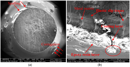 Figure 4 shows the typical corrosion fatigue fracture characteristics of a MAO coated sample with pore-sealing treatment in a 5.0 wt % NaCl solution. These characteristics include: (1) The corrugation and spalling behaviors were clearly seen on the surface of the sample, as depicted in Figure 4a (marked by arrows), while they were not found on the surface of samples without a pore-sealing treatment [14]. (2) The corrosion fatigue crack initiation occurred preferentially at the position of maximum accumulation of epoxy resin, close to the primordial shrinkage cavities (marked by the elliptical ring), in which one crack penetrated from the coating to the substrate—as shown in Figure 4b. However, the interfacial crack between the coating and the substrate was not found in Figure 4b, which further validated that using the MAO coating technology, the adhesion strength was high [5,6]. (3) A large number of plastic slip striations appeared nearby the sub-surface of the substrate in Figure 4b. The directions of plastic slip striations were 30–50° tilted to the rotation direction of the sample, which hinted that in the fracture surface, there was not only a normal stress but also a shear stress; this made it easy to cause the crack initiation and propagation [15]. The striations and directions, as shown in Figure 4b, indicated a discontinuous crack propagation mechanism: an electrochemical attack on plastic deformation zones [23]. Obviously, the reduction in the accumulation of epoxy resin during the pore-sealing process can turn down the occurrence probability of penetrated cracks so that the corrosion fatigue performance of the coating-substrate could be improved. References should be cited in numerical order.
