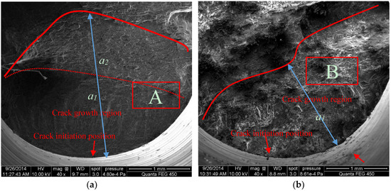 Figure 5 shows the typical corrosion fracture characteristics of 7075-T7351 Al alloy with a MAO coating without the pore-sealing treatment. There are clear differences between fracture surfaces in air and in a 5.0 wt % NaCl aqueous solution, as shown by Figure 5a,b. In air, the fatigue crack propagation region can be divided into two (regions a1 and a2), and the fatigue crack initiation position can be identified at the red arrow mark (Figure 5a). In NaCl solution (Figure 5b) the fatigue crack propagation length a1 is smaller than a1 + a2 (Figure 5a); however, this does not indicate that the corrosion fatigue crack growth rate in NaCl solution is less than in air because of the electrochemistry reaction, and coupled action of corrosive liquid and stress in NaCl solution [15]. In addition, the corrosion fatigue crack initiation can be identified by the red arrow marks (Figure 5b). On the other hand, the typical magnifying images in air and a 5.0 wt % NaCl solution show the opening displacement of second cracks and concave-convex characteristics in the fatigue crack propagation processes (Figure 5c,d), in which the opening displacement of second cracks in air is less than in a 5.0 wt % NaCl solution, and concave-convex patterns are different between the two media. The microscopic fracture characteristics are also in good agreement with previous works [24,25]. A similar trend was observed for thicker coatings.