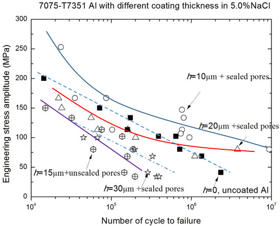 For 7075-T7351 Al alloy, other significant influence factors of fatigue performance are the MAO coating thickness and the environmental medium. The results in typical environmental medium (a 5.0 wt % NaCl aqueous solution) are shown in Figure 8. Although there are some scattered data in the corrosion fatigue test, the overall trend of S-N curves for 7075-T7351 Al alloy with different MAO coating thicknesses (marked by different lines) can be clearly seen. With the increasing of MAO coating thickness, the corrosion fatigue performance reduces. In NaCl solution, the difference of corrosion fatigue performance between h = 10 μm and h = 20 μm is more pronounced, compared with that in air (Figure 7). This means that the corrosion fatigue performance of 7075-T7351 Al alloy is sensitive to the MAO coating thickness. When compared to the other alloys (without MAO coating, with a coating of h = 15 μm without the pore-sealing treatment, and with a coating of h = 20 μm and h = 30 μm with the pore-sealing treatment), the corrosion fatigue performance of the h = 10 μm MAO coated alloy with the pore-sealing treatment is still optimal. In addition, Table 3 shows that with the increasing of MAO coating thickness, the residual compressive stress in the coating also increases. Therefore, the effect of residual compressive stress on corrosion fatigue performance of 7075-T7351 Al alloy with a MAO coating can be equivalent to the effect of MAO coating thickness. This reflects that the corrosion fatigue performance of 7075-T7351 Al alloy with a MAO coating can also be enhanced using the pore-sealing treatment, but that there is an optimal MAO coating thickness that is interrelated to the residual compressive stress level in the coating. For coatings thinner than 10 µm, there are few or no cracks after the pore-sealing treatment, which leads to a better fatigue performance. For coatings thicker than 10 µm, cracks in the inner coating are not filled well, leading to a lower fatigue resistance.