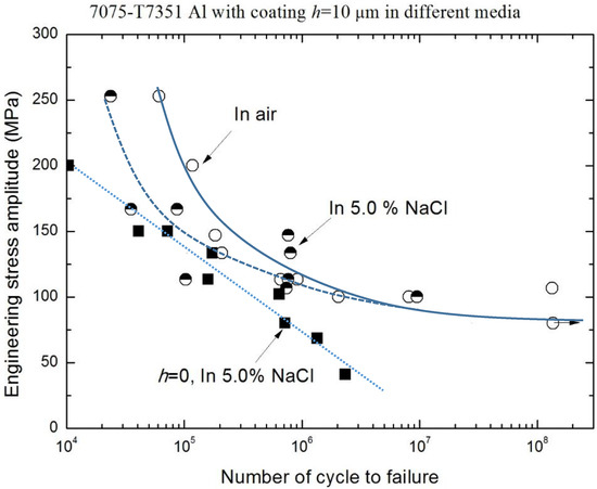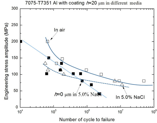 Figure 9 and Figure 10 show the effect of an environmental medium on the fatigue performance of 7075-T7351 Al alloy with h = 10 μm and h = 20 μm, respectively. As for h = 10 μm, the fatigue limits (σ−1) in air and in a 5.0 wt % NaCl aqueous solution are approximately the same (about 102 MPa), as shown in Figure 9. This hints that in the low stress level, a MAO coating with the pore-sealing treatment makes it difficult to produce the corrugation or spalling behavior; the protective layer plays an important role in inhibiting corrosion fatigue crack initiation. However, in the high stress level (over 150 MPa), the effect of an environmental medium on the fatigue performance of 7075-T7351 Al alloy cannot be ignored, as shown in Figure 9. That is, in the high stress level, the corrugation or spalling behavior and the coupling action between the environmental medium and stress occur easily in the MAO coating layer. Figure 10 shows that for 7075-T7351 Al alloy with h = 20 μm, the corrosion fatigue limit in a 5.0 wt % NaCl aqueous solution is slightly smaller than for in air. Likewise, the fatigue performance can be affected by the environmental medium in the high stress level.