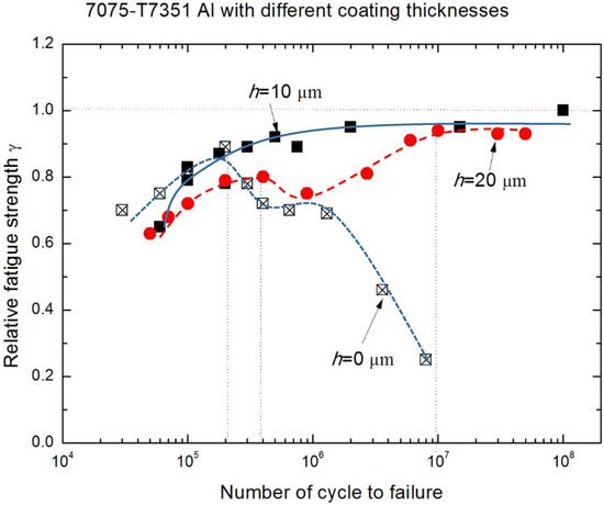 - The relative fatigue strength ratio (γ = σNaCl/σair) indicates that the major effect of MAO coating thickness on corrosion fatigue behavior occurs within the range from 1 × 105 to 1 × 107. Compared with γ of uncoated 7075-T7351 Al alloy, the MAO coating using the pore-sealing treatment can enhance the corrosion fatigue performance.