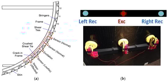 The nature of the structure suggested the use of UGW: the ultrasonic waves can travel inside the different components of the assembly that behave as natural waveguides. Moreover, the complexity of the panels, in terms of size, curvature, material, and number of interfaces and travelling paths, requires wide area coverage and low attenuation, properties that can be satisfied by UGW. The schematic below (Figure 2a) shows the adopted inspection approach: the excitation is sent from the outside skin, the wave penetrates into the stringers and shear ties, travels into the C-frames and, after interacting with defects if present, can be collected again from receivers placed on the outer skin.