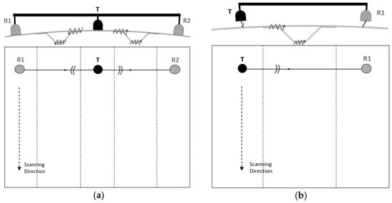 Line scanning approach for (a) a contact system and (b) a non-contact system; cross-sectional view (top drawings) and front view (bottom drawings).