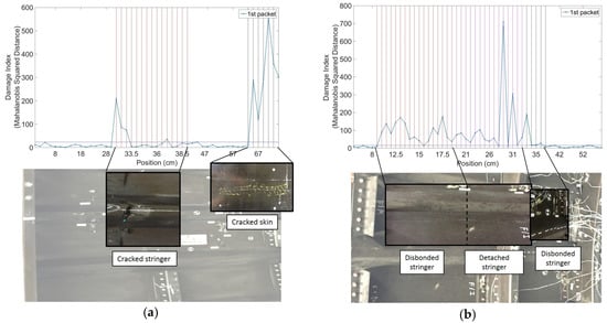 Representative results are shown in Figure 5a,b for Panel 1 and Panel 2, respectively. The vertical lines represent known positions of defects from the prior visual surveys and ultrasonic scans. It can be seen how the DI increases noticeably in known damaged areas, with very low noise levels, owing to the statistical outlier analysis. As expected from a skin-probing technique, the sensitivity to damage is higher for the skin defects than for the stringer defects, although the latter are also clearly visible over the very low noise floor of the pristine structure.