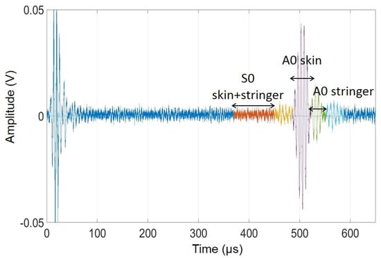 The feature extraction process is performed on selected time-gated wave packets, corresponding to different wave modes propagating in the stiffened panel structure. This selection relies on velocity information about the various propagating modes and enhances the sensitivity of the technique to specific defects.