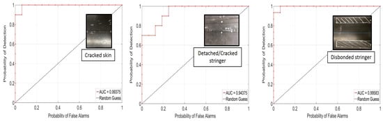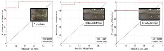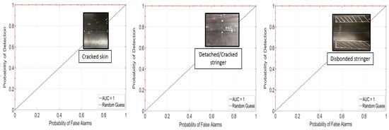 ROC curves were computed for each defect type at varying DI thresholds: a curve located in the upper left corner of the plot indicates a good defection performance (high POD and low PFA). The area under the curve (AUC) is a metric that summarizes this goodness in performance. The dashed straight line represents the 50–50 guess.