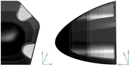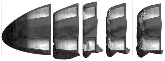 The deformation results for the model run that achieved the highest peak deceleration (Slim factors set to 1.0, TSize set to 1 × 10−9 s, Erods set to 1.0 and Soft factor set to 0.0) is shown in Figure 28, Figure 29 and Figure 30. Figure 28 shows the deformation of the nose cone at different times during the impact test. It can be seen that after 0.05 s the rigidwall starts to rebound. Figure 29 shows the permanent deformation after the impact at 0.1 s. Figure 30 shows the elements that have exceeded the failure criteria in the longitudinal (Tensile/Compressive), transverse (Tensile/Compressive) and shear directions.