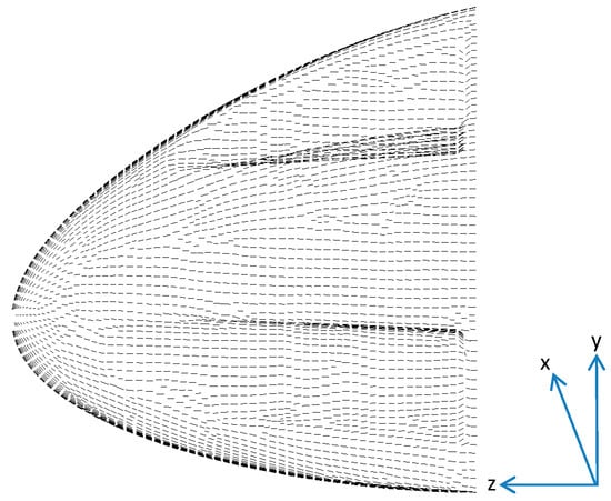 The original drawing for the nose cone was developed in 3D using Solidworks. Primer, the pre-processor used in this work, requires a mesh of the geometry in order to set up the other model parameters. To create a mesh the outside top surfaces of Solidworks drawings were exported as a Step file into Catia. The model was then reduced in half by removing the surfaces on one side of the central symmetry line. This enables a symmetry boundary condition to be implemented, which improves computational speed. The surfaces were then joined and modified to have split lines at positions where there was a variation in laminar thickness (see Figure 2).