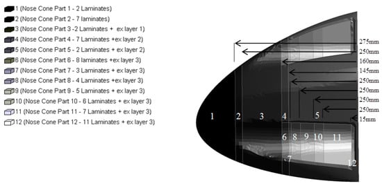 The CFRP material used in the CFRP nose cone was a 2/2 twill weave MTM57/CF3202 prepreg with a cloth weight of 245 g/m2. The volume percentage of resin has been assumed to be 42% in line with MTM57/CF3200 [22] giving a prepreg weight of 422.4 g/m2. The cured thickness of the prepreg was 0.3 mm giving a density of 1408 kg/m3. The model mass using this density (with dimensions as shown in Figure 1) was 0.63 kg. To match the mass of the nose cone used in the test and to allow for material run outs (thickness measurements were taken from manufactured cone) part 3 was given an additional 0.164 mm layer, parts 4 to 5 were given additional 0.18 mm layers and parts 6 to 12 were given additional 0.24 mm layers. This gave a final model mass of 0.724 kg.