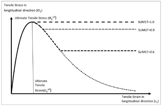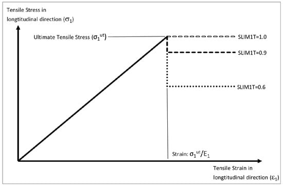 If the failure surface is set to 1.0 the failure criteria in the longitudinal and transverse directions include a shear stress term as well as a tensile stress term. If the failure surface is set to −1.0 the shear stress is treated separately which means that shear damage parameter only modifies the shear stiffness and not the normal stiffnesses. The implementation of the damage parameters into the Hashin criteria changes the loading and post-failure stress strain behavior of the composite. Three damage parameters are incorporated, which are related to tension failure in the longitudinal and transverse directions, compression failure in the longitudinal and transverse directions and shear failure. The form of the damage variable is given in Equation (1) (defined in this case in terms of normal stress),