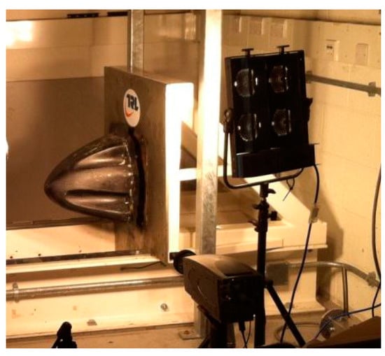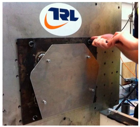 The nominal impact velocity was set to 7 m/s with a sled weight of 300 kg. The nose cone weight was 0.726 kg and the weight of the bolts and anti-extrusion plate was 1.543 kg. The velocity was measured using an infra detector operating at a frequency of 50 Hz [18]. The data logger was set to capture data at a frequency of 20 kHz. An SAE class 60 filter was applied to the raw displacement and deceleration test data, after the test, using the Oasys T/HIS data package. The nose cone mounting plate (anti intrusion plate) was offset from the sled impact face by 50 mm using four 8 mm Grade 8.8 bolts (see Figure 8).