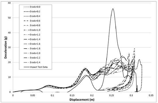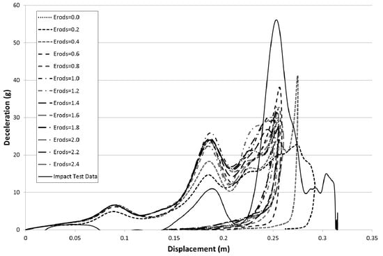 To study the various material parameters the model runs shown in Table 7, Table 8 and Table 9 were carried out. The deceleration versus displacement results for the rigidwall within the model for various values of maximum effective strain (Erods) are shown in Figure 11. The model deceleration-time and displacement-time curves were imported into the Oasys T/HIS data package and a SAE class 60 filter applied before exporting them into Excel for plotting against each other. The model parameters were set as follows; element deletion would occur if the step size fell below 1 × 10−11 s (TSize = 1 × 10−11), element stresses would stay at the failure stress values after element failure (All Slim = 1.0), no softening would occur in front of the crash front (Soft = 1.0) and failure would be governed by a smooth failure surface (FS = 1.0). The deceleration and displacement of the rigidwall are plotted as positive values in all the figures in this paper. The figures have also been cropped, to focus only on deceleration, to increase the image size. This removes small sections of the experimental curve which showed low acceleration values.