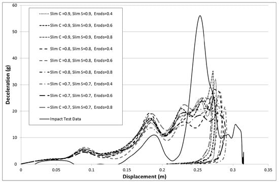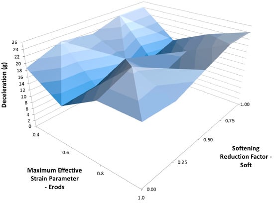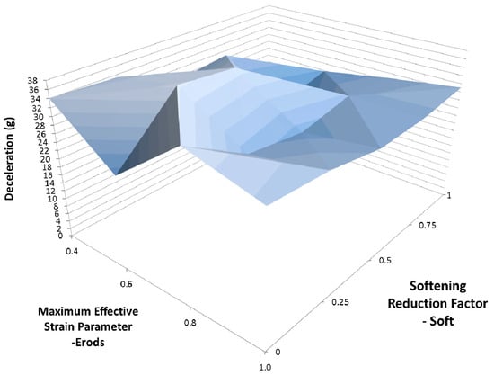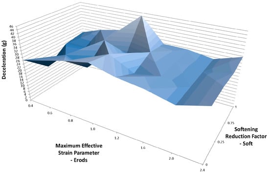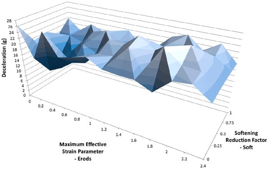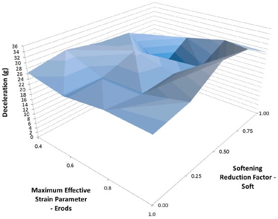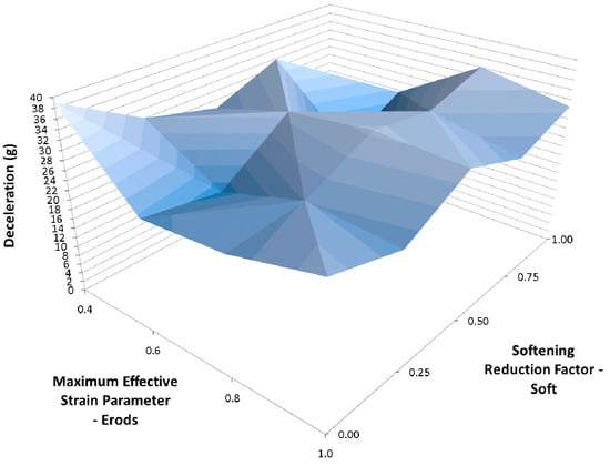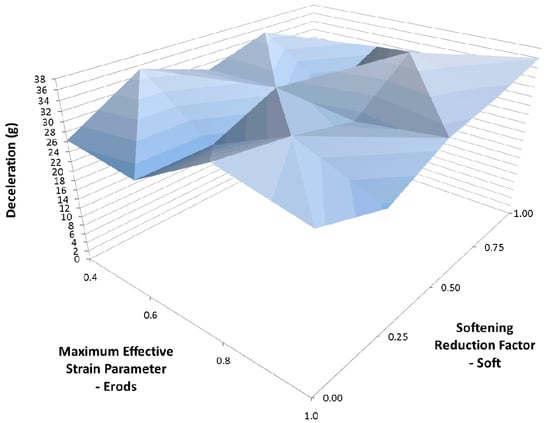 Due to the number of curves generated it was decided that a clearer way to assess them against the experimental data was to find the maximum deceleration for each curve between the displacements of 0.23 m and 0.29 m and plot the results against each other as surface plots (see Figure 12, Figures 14–21 and Figures 24–26). Figure 12 shows the effect of changing the Erods parameter and the Soft factor while keeping all the other model values the same as for Figure 11 (Table 6—Set 1).
