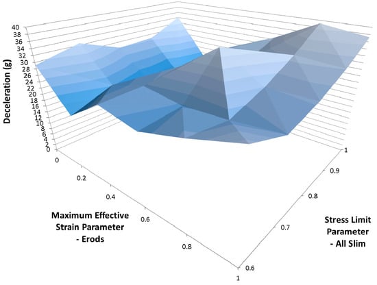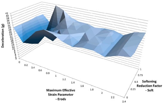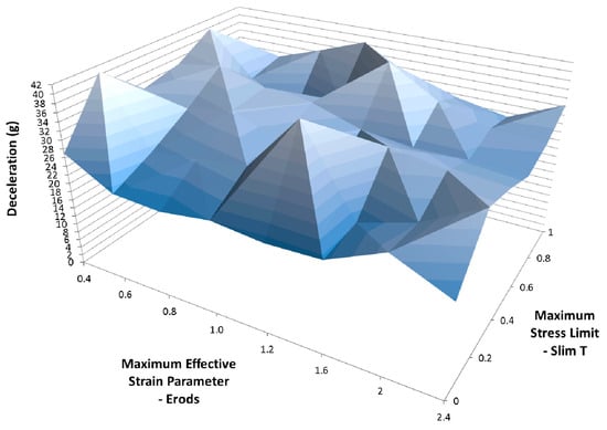 To investigate the effect of TSize as well as post-failure softening it was decided to use three different TSize values with a Soft value of 1.0 (no softening of crash front) and the Erods and Slim factors set between 0.0 to 1.0 and 0.6 to 1, respectively. The generated surface plots were similar to each other but lower TSize’s gave slightly better results. The highest deceleration of 39.2 g was achieved with a TSize of 1 × 10−9 and an Erods parameter of 0.8 (see Figure 24).