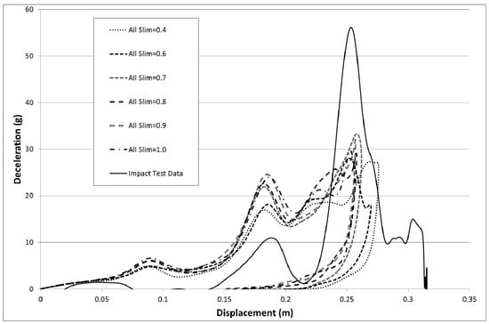 To investigate whether the Soft factor influences the impact of the lower Slim T parameter values, several models runs were carried out where both the Soft factor and the Slim T parameters were varied (see Figure 18, Figure 19, Figure 20, Figure 21 and Figure 22). The TSize was set to 1 × 10−11 s to reduce the effect of element deletion on the results. No strong influence was found in terms of the Soft factor. The highest deceleration of 39 g was obtained for a Slim T parameter of 0.2, an Erods parameter of 0.4 and a Soft factor of 0.0 (see Figure 18). This peak deceleration was at a displacement position of 0.275 m.