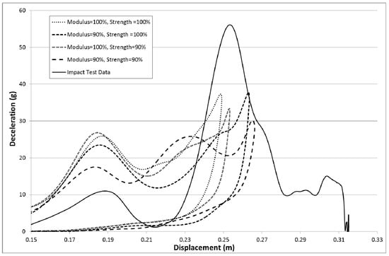 As the material properties were gathered from papers, and seeing that post-failure strength had an effect, it was decided to investigate whether small changes in strength or moduli properties might improve the results. Figure 25 shows curves for a 10% reduction in the moduli values, a 10% reduction in strength values and 10% reduction in moduli and strength values. The 10% reduction in strength increased the peak deceleration, but not significantly. Reducing the moduli did create a more substantial increase in peak deceleration but shifted the displacement of the peak away from the experimental peak position. Reducing both moduli and strength caused a peak displacement shift and resulted in a negligible increase in peak deceleration. It did though reduce the initial over-prediction of deceleration during the early stages of the impact.