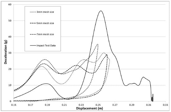 Varying parameters such as Soft, Erods, TSize and Slim has some effect on increasing the peak deceleration but there was no solution that gave high peaks at the experimental high peak displacement position. Generally setting the Soft factor to either 0.0 or 1.0, the Slim factors to 1.0, the Tsize around 1 × 10−8 or 1 × 10−9 s and the Erods parameter around 1.0 was shown to give the best experimental fit. The models displayed mesh sensitivity and run-to-run variation for identical models, which indicates time-step sensitivity as well. The highest peak deceleration obtained numerically, within the rigidwall displacement range of 0.23 to 0.29 m, was about 30% lower than the experimental value.