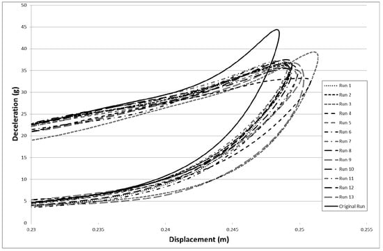 When running some repeat models, it became clear that runs using the same input file could generate slightly different deceleration displacement curves. To check this, repeated runs of the model that had given the highest initial peak deceleration were carried out, as shown in Figure 27. As can be seen there is some divergence in the curves. This is probably due to time-step size variations, which are generated by slight hardware differences on the computer nodes used on the high-performance computing facility. There is no discussion of this with respect to explicit numerical codes but there is work using implicit codes showing that carbon composite damage progressive models are time-step sensitive [31].