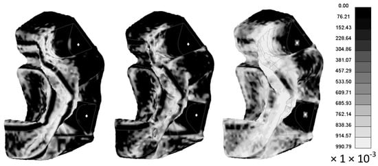 D3Plot images of longitudinal, transverse and shear damage (respectively) after impact of LS-Dyna model with settings All Slim = 1.0, TSize = 1 × 10−9, Erods = 1.0, Soft = 0.0 and FS = −1.0 (Black undamaged: 0, White fully damaged: 1).