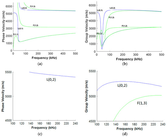 (a) Phase; and (b) group velocity dispersion curves for a steel pipe with a diameter of 33 mm and 4 mm in wall thickness. (c) Phase; and (d) group velocity dispersion curves for the same pipe within the least dispersive frequency region.