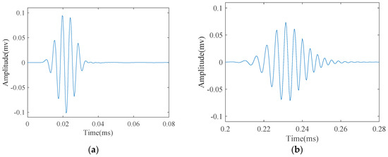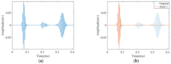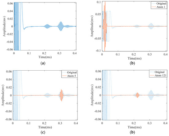 Figure 14a illustrates the measured signal from the abovementioned experimental setup. Unlike the signals obtained from FEM simulation, the signal is contaminated with some unwanted components. According to the parameters in Table 2, we tried to approximate this signal with SDMP. Despite having a contaminated signal, consistent with the simulation result, SDMP represents the signal with maximum sparsity. The first wave packet to be approximated as a first atom is the incident signal. In the position of the incident signal, there is electrical leakage from the equipment. However, as SDMP checks the frequency domain as well as the time domain for the selected atoms, only one atom is assigned to that location. The second and third atoms are representing the reflection from the end and the defect, respectively.