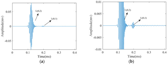 Longitudinal guided wave modes emitted at a 220 kHz center frequency as a five-cycle tone-burst signal into: (a) a pipe; and (b) the zoomed wave signal.