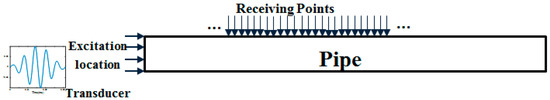According to the dispersion curves depicted in Figure 1, the least dispersive region for L(0,2) mode starts roughly from 100 kHz to 240 kHz. In order to design an over-complete dictionary that includes this region, we swept the frequency from 100 kHz to 240 kHz with the step of 5 kHz. In each frequency step, the phase θ was kept constant equal to zero. Excitation of guided waves was carried out by applying a time-varying displacement according to Equation (3) on one end of the pipe. Guided wave signals were collected at every 1 mm from the excitation point (Figure 5). It must be noted that; in practice, a reflection of the signal from a defect will result in a phase shift. The reflected signal has the reverse phase of the direct one [49]. For considering the reversed-phase time-transient responses in our dictionary, instead of repeating the simulation with θ = π, to reduce computational cost we used Fast Fourier Transform (FFT). Doubling the size of our dictionary, it will include both direct signals with θ = 0 and reflection signals with θ = π.