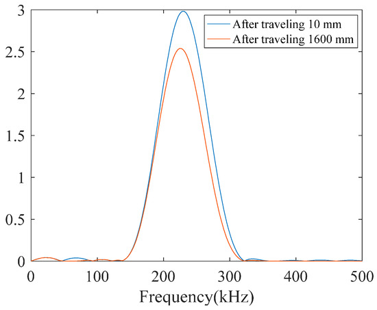 Frequency response of the L(0,2) mode tone-burst wave packet that emitted at a center frequency of 220 kHz and its bandwidth after traveling 10 mm and 1600 mm along the pipe.