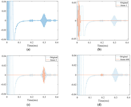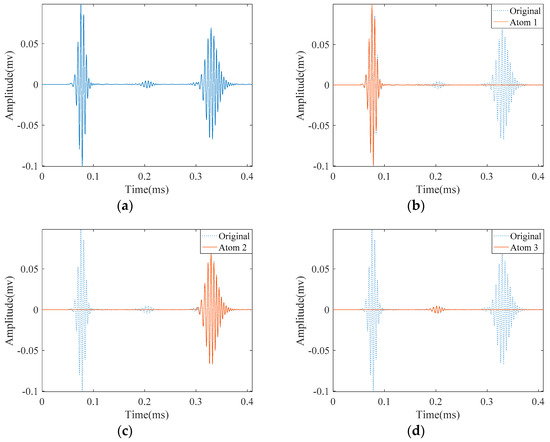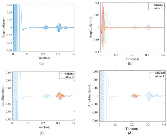 Results obtained by applying SDMP to the simulation signal in a pipe with a small crack: (a) the original signal of the propagating guided wave; (b) approximated atom 1—the direct signal; (c) approximated atom 2—the reflection from the pipe end; and (d) approximated atom 3—the reflection from the crack.