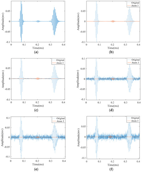 Detection of the small crack in the presence of noise with different signal to noise ratios (SNRs) with Sparse Representation with Dispersion Based Matching Pursuit (SDMP): (a) the original signal; (b) the approximation of crack reflected signal without noise; and with added noise that has: (c) SNR = 23.8 dB; (d) SNR = 9.8 dB; (e) SNR = 6.8 dB; and (f) SNR = 5.8 dB.