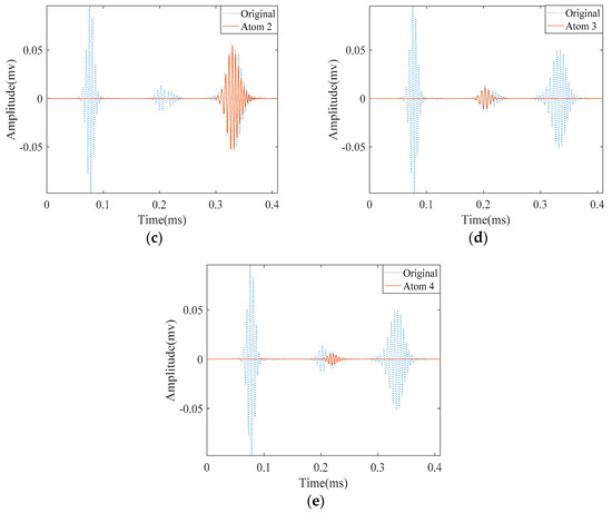 Results obtained by applying SDMP to the simulation signal in a pipe with 27 mm length notch: (a) the original signal; (b) approximated atom 1—the direct signal; (c) approximated atom 2—the reflection from the pipe end; (d) approximated atom 3—the reflection from the first edge of the notch; and (e) approximated atom 4—the reflection from the second edge of the notch.
