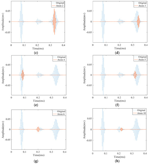 Results obtained by applying MP to the simulation signal in a pipe with the 27 mm length notch: (a) the original signal; (b) approximated atom 1—the direct signal; (c) approximated atom 2—the reflection from the pipe end; (d) approximated atom 3—the reflection from the pipe end; (e) approximated atom 4—the direct signal; (f) approximated atom 5—the reflection from the pipe end; (g) approximated atom 6—the reflection from the first edge of notch; and (h) approximated atom 10—the reflection from the second edge of notch.