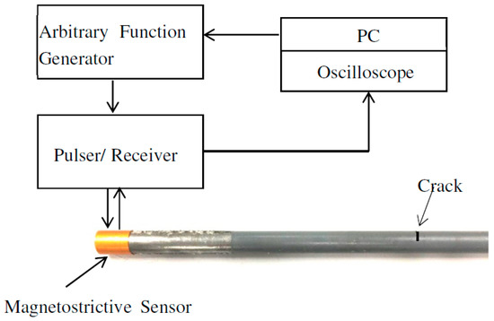 In practice, the success of SDMP depends on its performance in representing real experimental data. In order to demonstrate the potential capabilities of the proposed method, the experiment was conducted on an 80 cm long steel pipe. It was standard pipe delivering natural gas to residential buildings with the diameter of 33 mm and 4 mm wall thickness. For corrosion protection, such standard pipes have thin multilayer cover consists of zinc epoxy and acrylic. A crack representing a defect was artificially made on the pipe with a saw. In our experiment, we used magnetostrictive sensor (MsS) for exciting and receiving L(0,2) mode in pulse-echo mode. The MsS sensor consists of flexible printed coil (FPC) [58] and a smart material which is a highly ferromagnetic patch [59]. The role of the patch is to enhance magnetostriction effect and consequently SNR. In this patch, guided waves can be generated and detected using the Joule and Villari magnetostrictive effects which refer to a physical dimensional change due to an application of magnetic field or, inversely, a magnetic flux change due to an application of mechanical strain [60]. For the excitation of L(0,2) mode at the selected frequency five-cycle tone-burst signal modulated by Hamming window according to Equation (3) was delivered through an arbitrary signal generator and generated by an RITEC 4000 pulser and receiver (RITEC Inc., Warwick, RI, USA). Figure 13 shows the schematic diagram of the experimental setup employed for guided-wave-based damage detection applications.