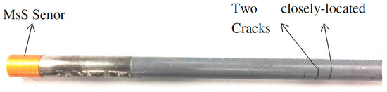 In the second of our experiment, in order to further verify the capability of SDMP in separating overlapped modes, we conducted an experiment on the same pipe with some alteration. We added another crack on the same pipe that had a 22 mm distance in the axial direction from the initial crack. The two cracks together with MsS Sensor on the pipe are shown in Figure 16.