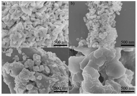 SEM micrographs for (a) p-800; (b) z5-800; (c) z5-900 and (d) z5-950 samples.
