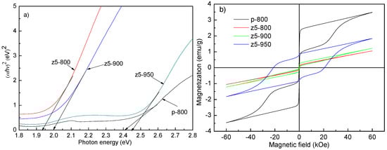 (a) Optical band gaps and (b) room-temperature magnetic hysteresis loops for p-800, z5-800, z5-800, and z5-950 samples.