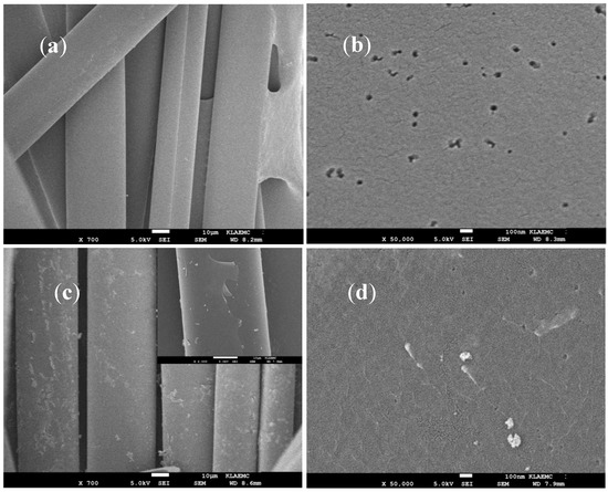 Scanning electron micrographies of the surface of wood-based activated carbon fiber (WACF) (a,b) and Mn/TiO2–WACF (c,d).