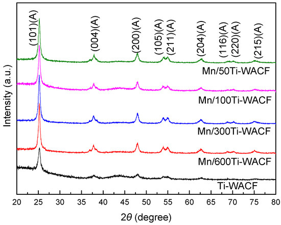 Table 1 presents the average crystallite size of modified nano-TiO2, which were calculated based on Scherrer formula. The grain size of nano-TiO2 gradually increases with increasing Mn doping concentrations. The crystallite sizes (25.4–27.8 nm) of TiO2 after doping Mn were obviously smaller than that of undoped Mn, indicating that Mn doping can inhibit the growth and agglomeration of TiO2 grains. This small size promotes TiO2 to evenly and firmly wrap on the surface of WACF, providing a superior condition for the photocatalytic reaction.