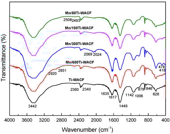 FTIR spectra of TiO2 doped with different Mn doping concentration on WACF are shown in Figure 3. Stretching and bending vibration of hydroxyl groups of all loaded materials were in the range of 3200–3600 cm−1 and 1617–1635 cm−1, and the stretching vibration band intensity of Mn-doped samples was clearly stronger than that of the undoped sample, indicating that TiO2 had a stronger adsorption with Mn-doping. The absorption bands of loaded materials at 1444 cm−1 were associated to the stretching of C–H bonds and C–O–Ti. A smaller amount of Mn doping caused intensity enhancement of absorption bands, indicating that less Mn doping promotes TiO2 loading on the WACF surface, as observed in the XRD measurements. Moreover, the absorption bands of all loaded materials in the vicinity of 618 cm−1 belonged to the characteristic absorption peaks of anatase TiO2 (consistent with the XRD test results), which represented the bending vibration of Ti–O, and the peak intensity was bounded by the Mn/Ti molar ratio of 1:300. With the increase of Mn doping amount, Ti–O bending vibration intensity would initially increase and then decrease, and the intensity of Mn-doped materials was bigger than that of pure TiO2. The latter had only Ti–O bending vibration, and the former has Ti–O and Ti–O–Mn bond; this finding indicates that Mn doping was good for TiO2 loading on WACF and for the formation of anatase TiO2. The absorption band of the undoped and doped samples is over the range of 846–878 cm−1; the former had a weak band and only Ti–O–Ti stretching vibration. The latter had stronger intensity bands due to the dual role of Ti–O–Ti and Ti–O–Mn [27].